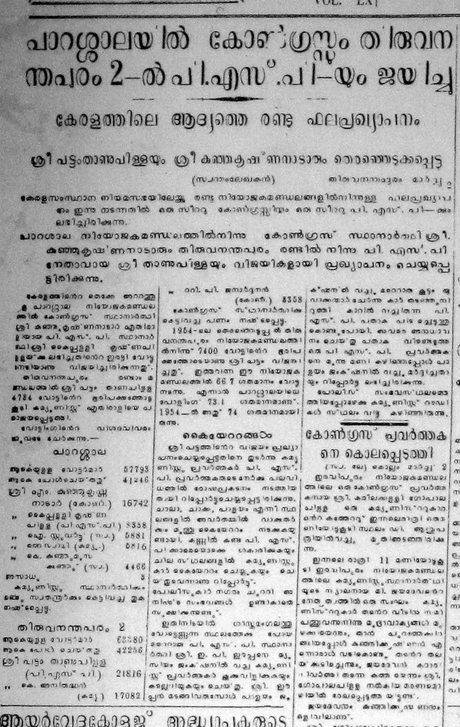 കേരളത്തില് നടന്ന ആദ്യ നിയമസഭാഫലം പുറത്തുവന്നത് മാര്ച്ച് രണ്ടിന് തിരുവനന്തപുരം രണ്ടില് മത്സരിച്ച പി.എസ്.പി യിലെ പട്ടം താണുപിള്ളയുടേയും പാറശാല മണ്ഡലത്തില് മത്സരിച്ച ഇന്ത്യന് നാഷണല് കോണ്ഗ്രസ് സ്ഥാനാര്ഥി കുഞ്ഞുകൃഷ്ണന് നാടാരുടേയും വിജയ പ്രഖ്യാപനത്തോടെയാണ്. തിരുവനന്തപുരം രണ്ടാ മണ്ഡലത്തില് സി.പി.ഐ യിലെ കെ. അനിരൂദ്ധനെയാണ് , പട്ടം പരാജയപ്പെടുത്തിയത്.അവിടെ പട്ടത്തിന് 6784 വോട്ട് ഭൂരിപക്ഷം ലഭിച്ചു. പാറശാലയില് കുഞ്ഞുകൃഷ്ണന് നാടാര് പി.എസ് പി യിലെ കൈപ്പള്ളി കൃഷ്ണപിള്ളയെയാണ് പരാജയപ്പെടുത്തിയത്. ഫല പ്രഖ്യാപനത്തോടെ തിരുവനന്തപുരം സിറ്റിയുടെ പല ഭാഗ്ത്തും കമ്മ്യൂണിസ്റ്റുകാരും പി.എസ് പിക്കാരും തമ്മില് വഴക്കും കൈയ്യേറ്റങ്ങളും നടന്നു ചാല, ചാക്ക, പാളയം തുടങ്ങിയ സ്ഥലങ്ങളില് നടന്ന കൈയ്യാംകളികള് പോലീസ് ഇടപെട്ട് നിയന്ത്രിച്ചു. അതിനിടയില് പി.എസ്. പി സ്ഥാനാര്ഥിയായി ഇ.പി. ഈപ്പനെ ചിലര് മ്യൂസിയം ജംഗ്ഷനില് കൈയ്യേറ്റം ചെയ്തതായി പരാതി ഉണ്ടായി.