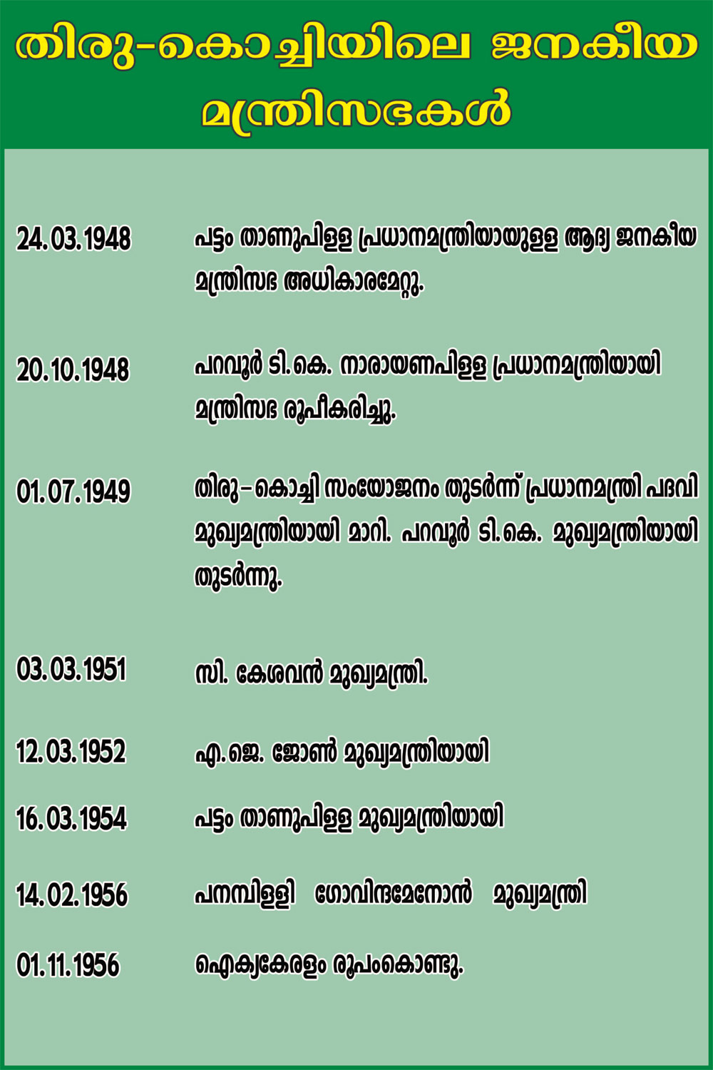 1956 നവംബര് ഒന്നിന് മലായാളികളുടെ സ്വപ്നമായ ഐക്യകേരളം നിലവില് വന്നു.തെക്കന് കാനറയിലെ കാസര്കോടും മലബാറും തിരു-കൊച്ചിയോട് ചേര്ത്തും തിരു-കൊച്ചിയുടെ തെക്കന് താലൂക്കുകളായ അഗസ്തീശ്വരം, വിളവന്കോട്, കല്ക്കുളം,തോവാള എന്നീ പ്രദേശങ്ങളും ചെങ്കോട്ടയുടെ ഒരു ഭാഗവും മദ്രാസിന് വിട്ടുകൊടുത്തു കൊണ്ടായിരുന്നു കേരള സംസ്ഥാന രൂപീകരണം.
